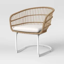 - All-weather wicker and metal patio chair maintains its look through the seasons